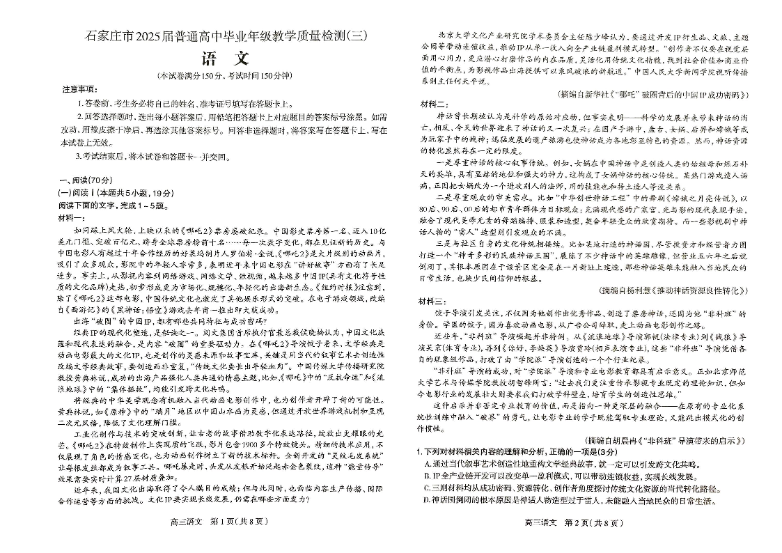 河北省石家庄市2025届普通高中毕业年级三模质量检测语文