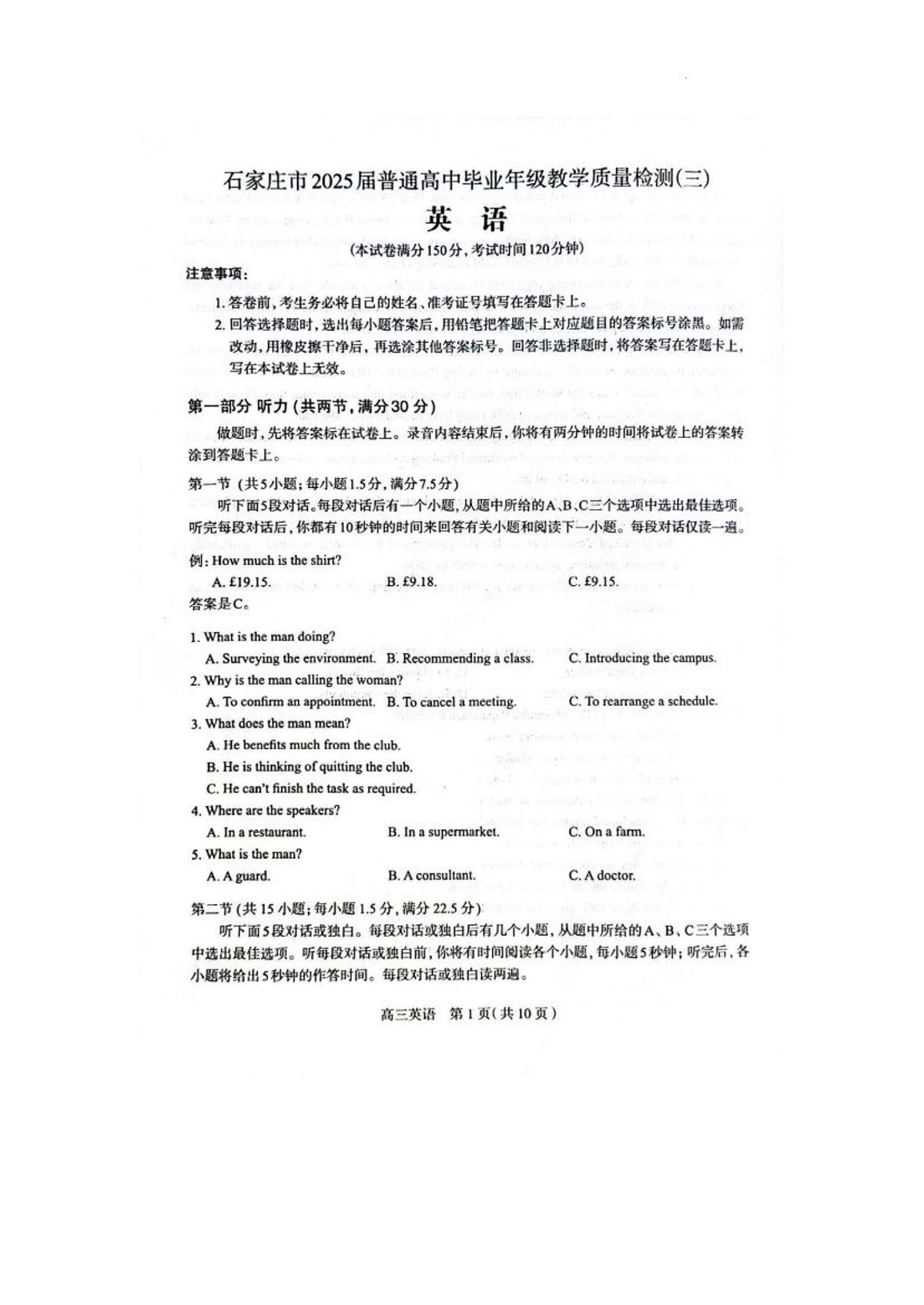河北省石家庄市2025届普通高中毕业年级三模质量检测英语+答案