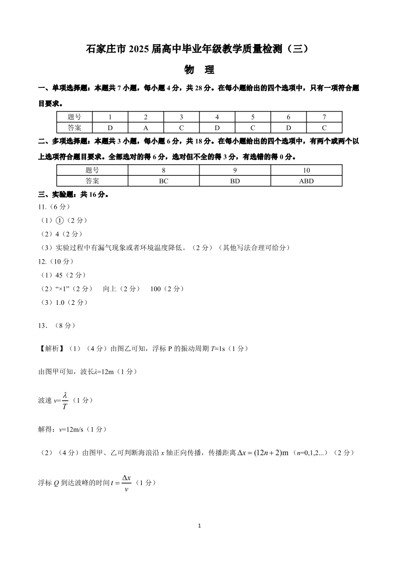 河北省石家庄市2025届普通高中毕业年级三模质量检测物理答案