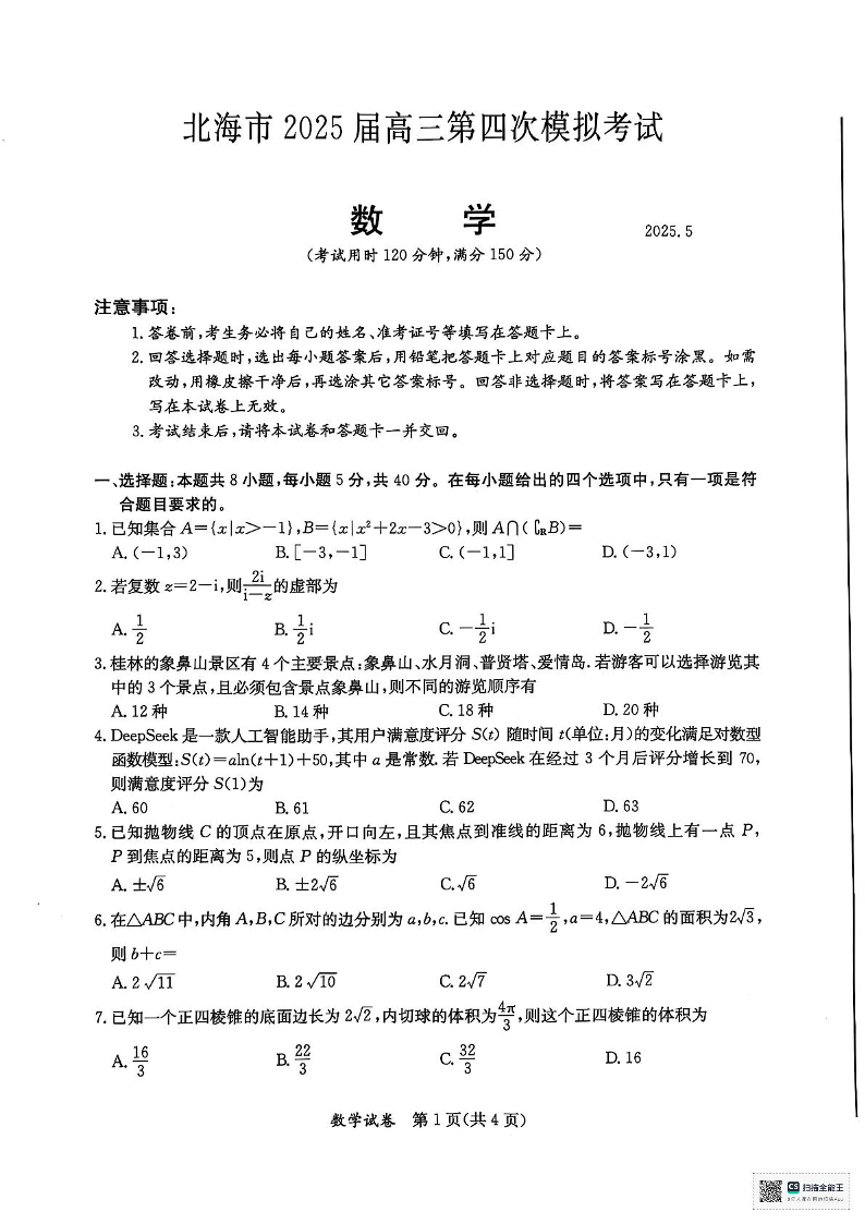 广西壮族自治区北海市2025届高三5月第四次模拟预测数学