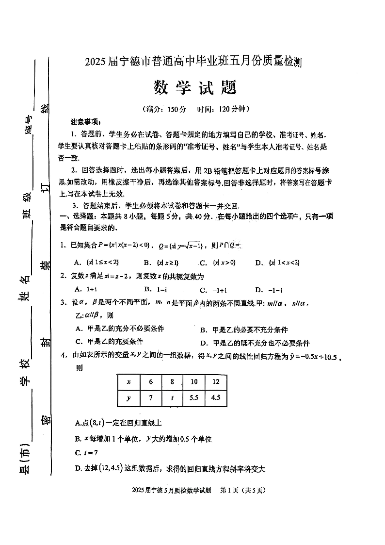 福建省宁德市2025届普通高中毕业班五月份质量检测数学