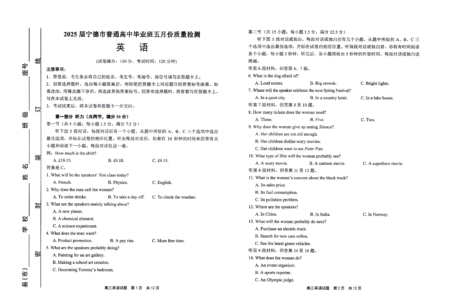 福建省宁德市2025届普通高中毕业班五月份质量检测英语