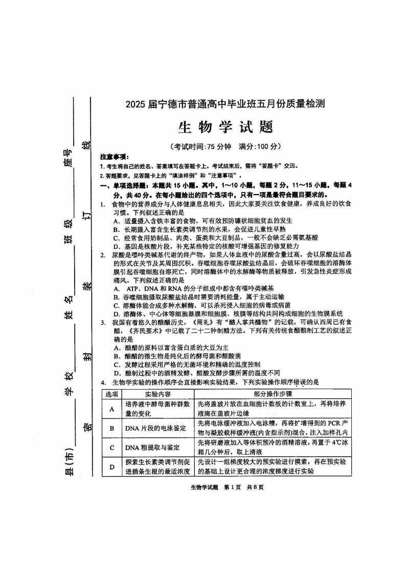 福建省宁德市2025届普通高中毕业班五月份质量检测生物