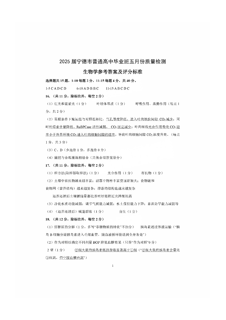福建省宁德市2025届普通高中毕业班五月份质量检测生物答案