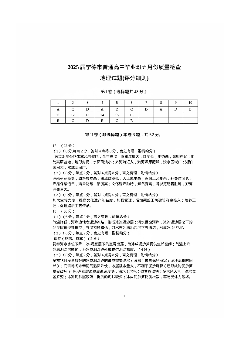 福建省宁德市2025届普通高中毕业班五月份质量检测地理答案