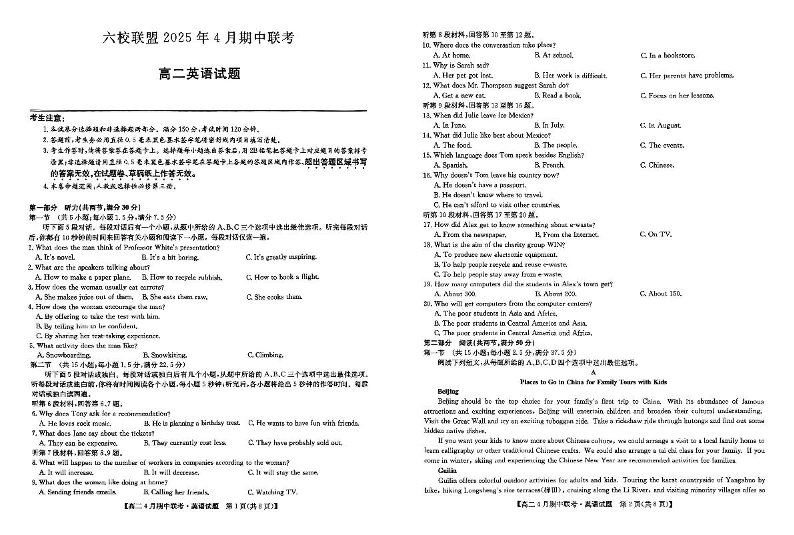 河北省保定市六校联盟2024-2025学年下学期4月高二期中考试英语+答案