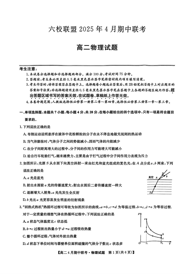 河北省保定市六校联盟2024-2025学年下学期4月高二期中考试物理+答案