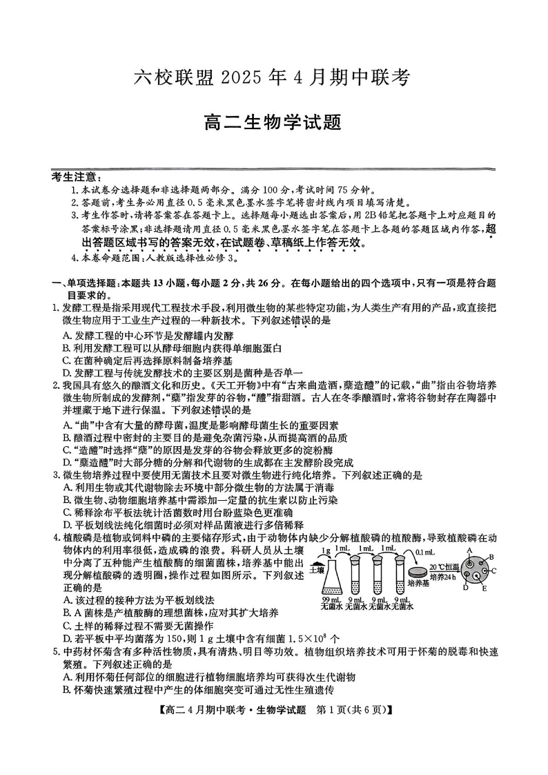 河北省保定市六校联盟2024-2025学年下学期4月高二期中考试生物+答案