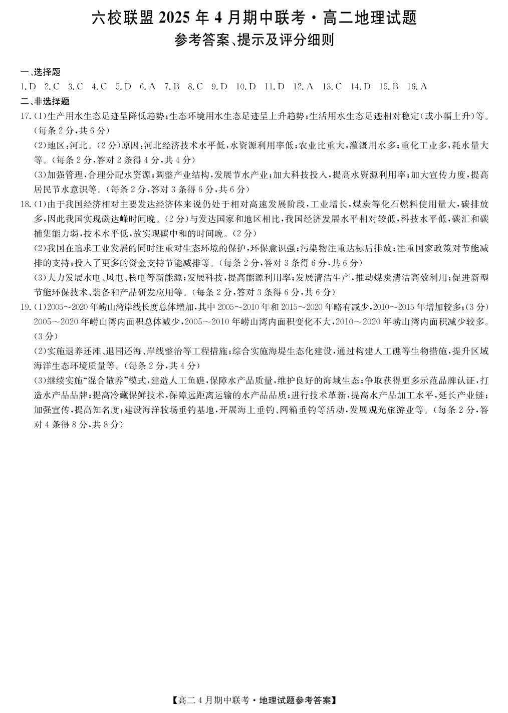 河北省保定市六校联盟2024-2025学年下学期4月高二期中考试地理答案