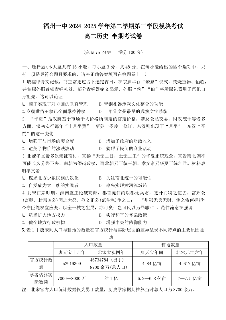 福建省福州第一中学2024-2025学年下学期高二期中考试历史+答案