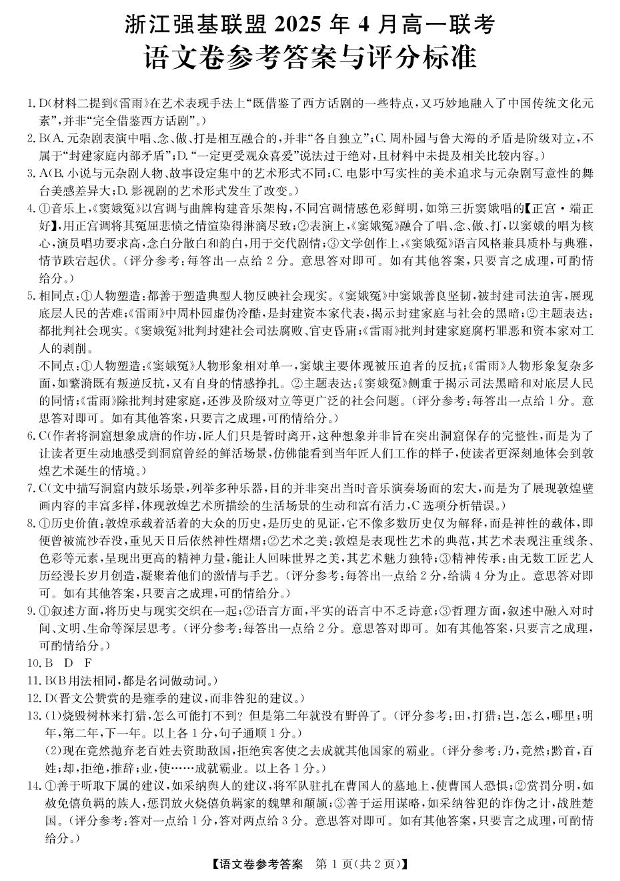 浙江省强基联盟2024-2025学年高一下学期4月期中联考试题语文答案