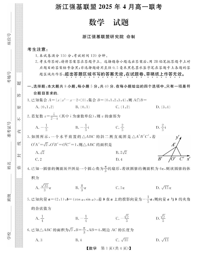 浙江省强基联盟2024-2025学年高一下学期4月期中联考试题数学