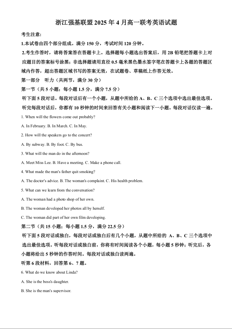 浙江省强基联盟2024-2025学年高一下学期4月期中联考试题英语+答案