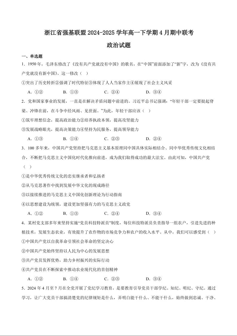 浙江省强基联盟2024-2025学年高一下学期4月期中联考试题政治+答案