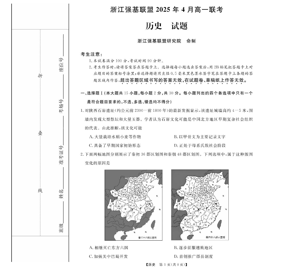 浙江省强基联盟2024-2025学年高一下学期4月期中联考试题历史+答案