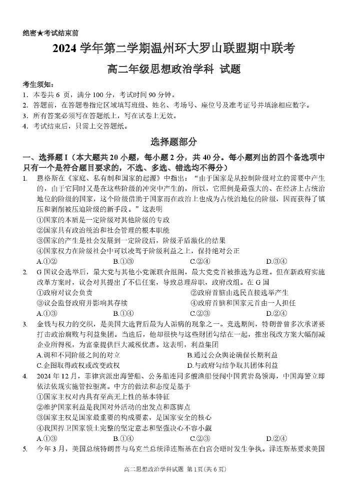 浙江省温州市环大罗山联盟2024-2025学年下学期高二期中考试政治+答案