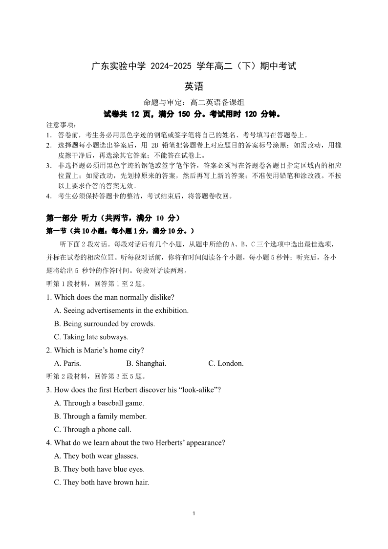 广东省实验中学2024-2025学年下学期高二期中考试英语