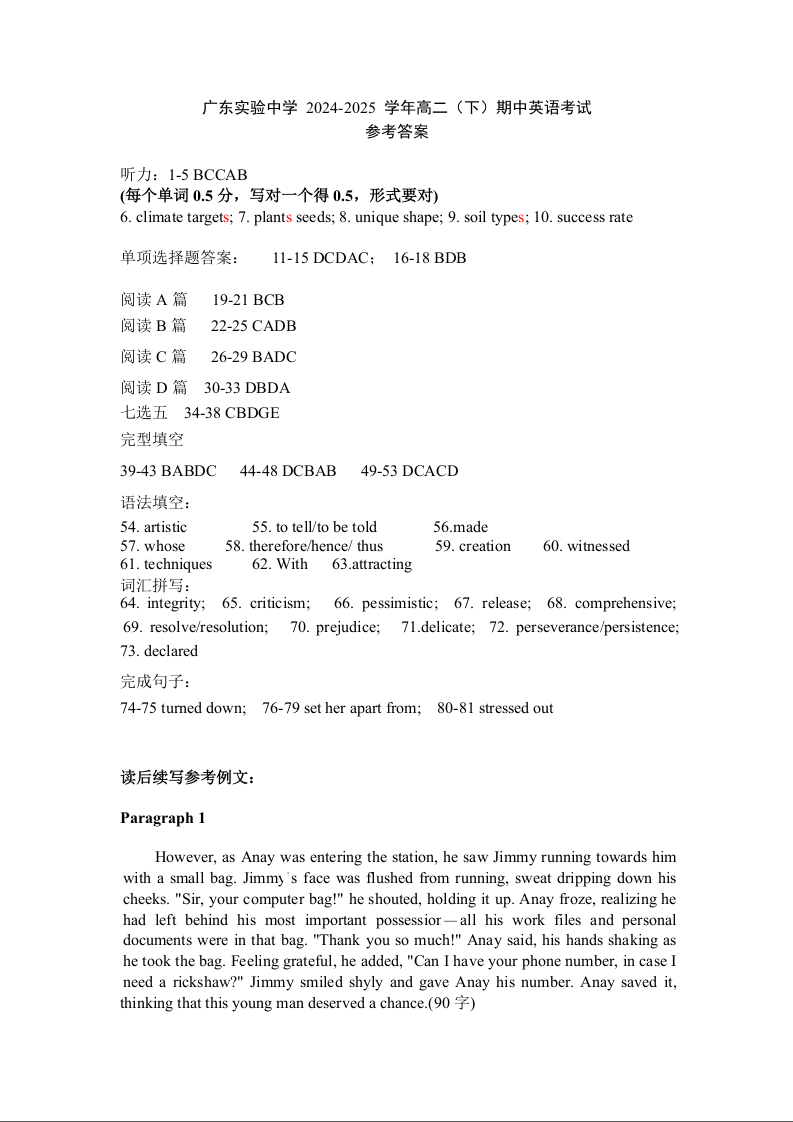 广东省实验中学2024-2025学年下学期高二期中考试英语答案