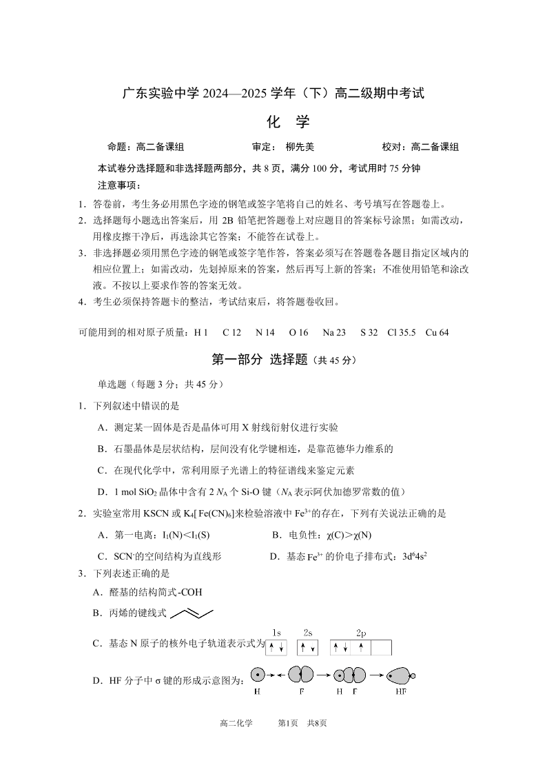 广东省实验中学2024-2025学年下学期高二期中考试化学