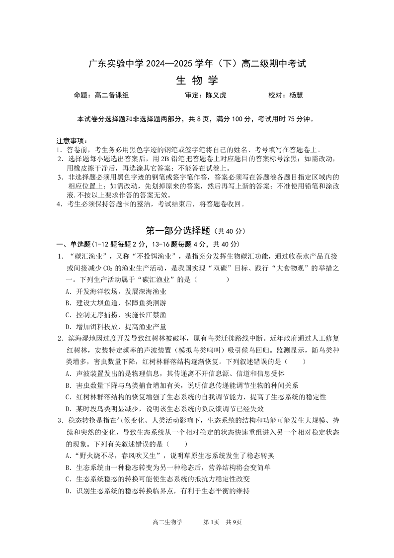 广东省实验中学2024-2025学年下学期高二期中考试生物