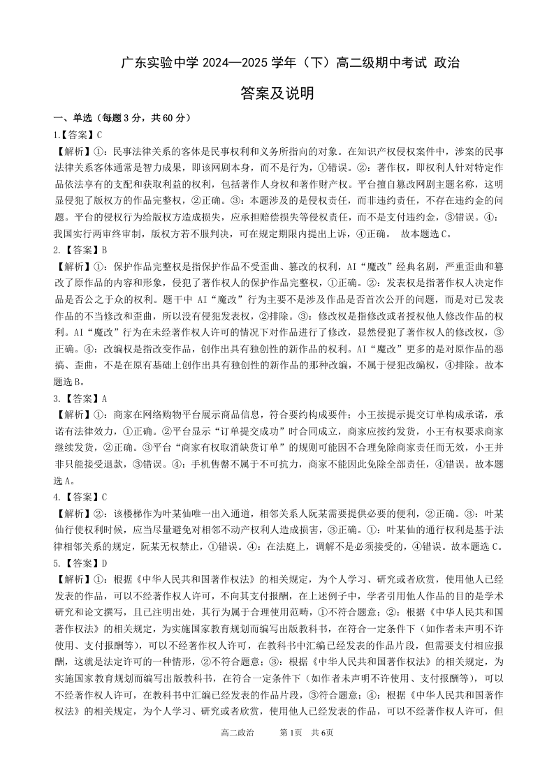 广东省实验中学2024-2025学年下学期高二期中考试政治答案