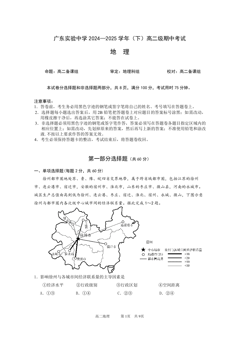 广东省实验中学2024-2025学年下学期高二期中考试地理