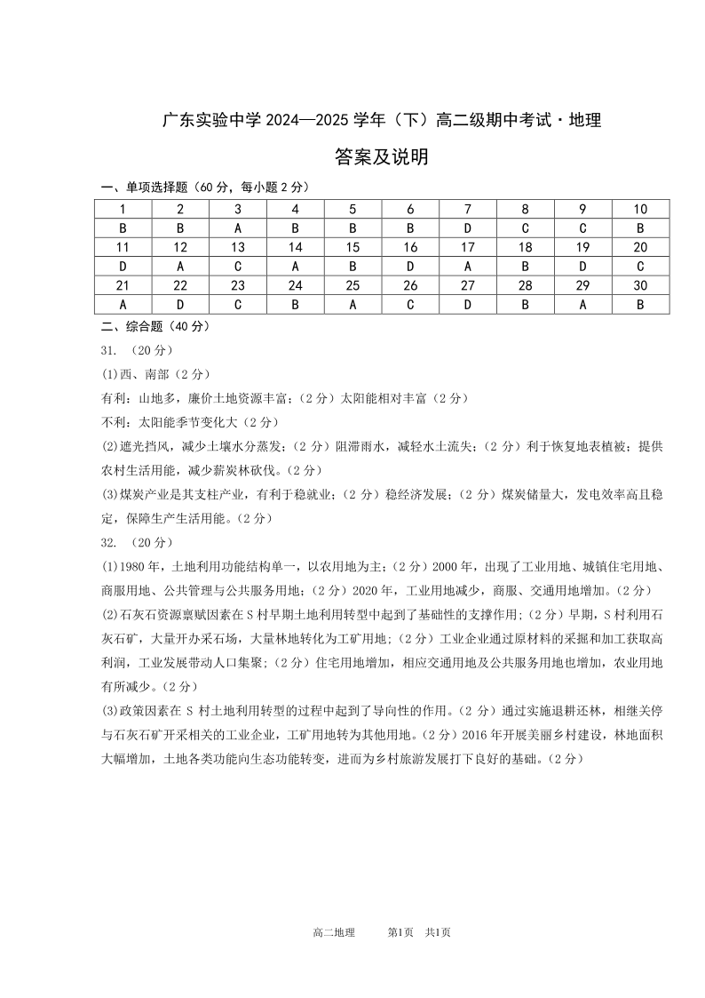 广东省实验中学2024-2025学年下学期高二期中考试地理答案