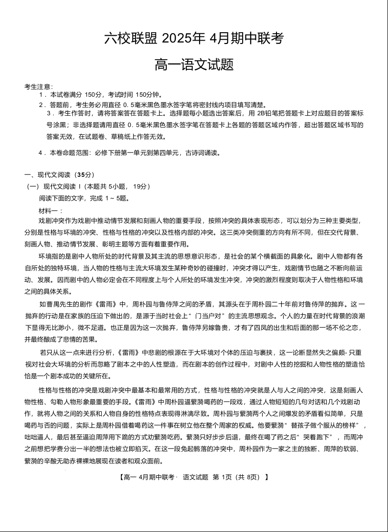 河北省保定市六校联盟2024-2025学年下学期4月高一期中考试语文