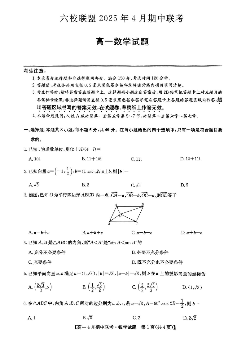 河北省保定市六校联盟2024-2025学年下学期4月高一期中考试数学