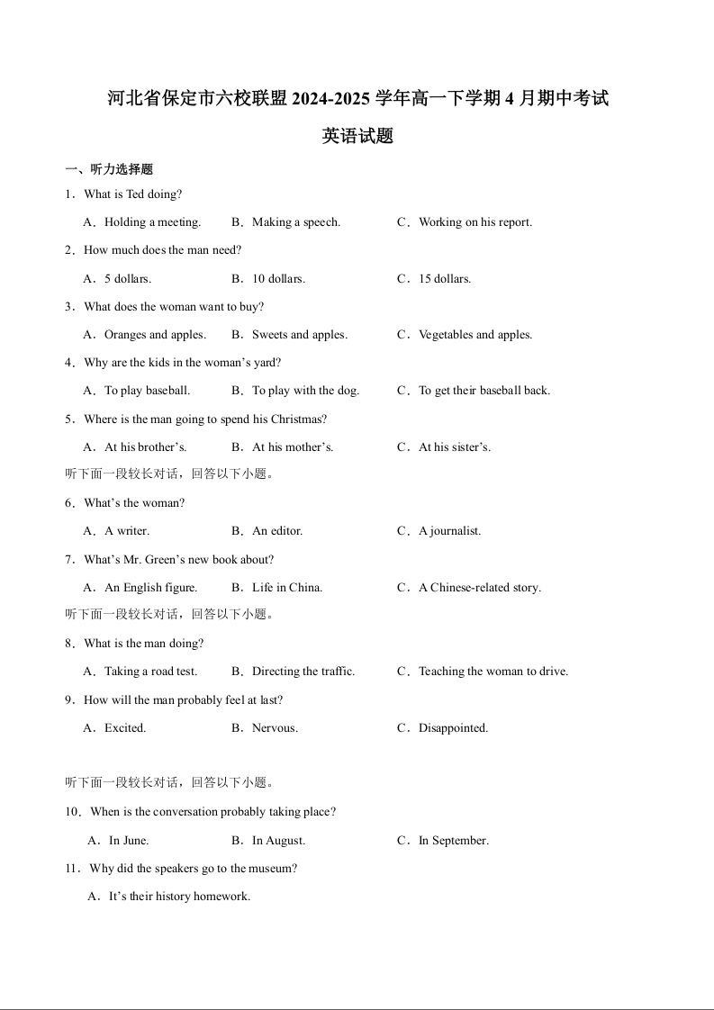 河北省保定市六校联盟2024-2025学年下学期4月高一期中考试英语+答案
