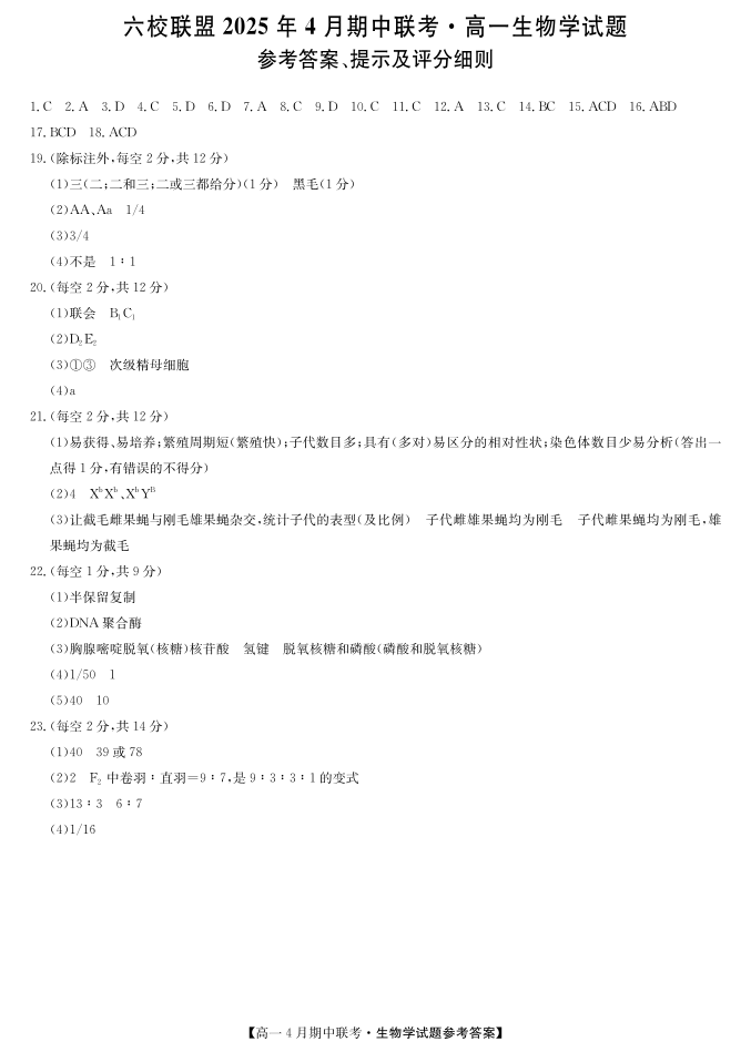 河北省保定市六校联盟2024-2025学年下学期4月高一期中考试生物答案