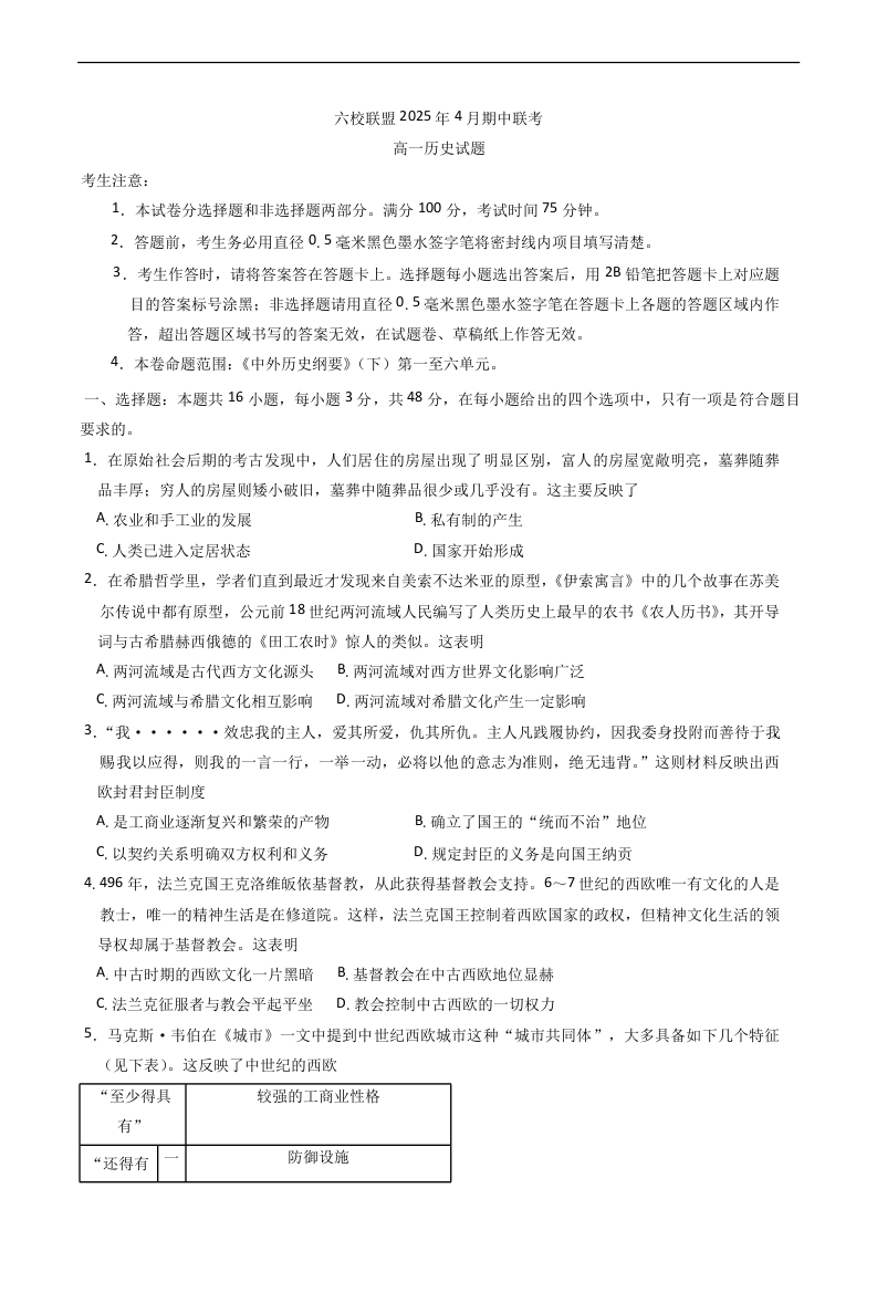 河北省保定市六校联盟2024-2025学年下学期4月高一期中考试历史+答案