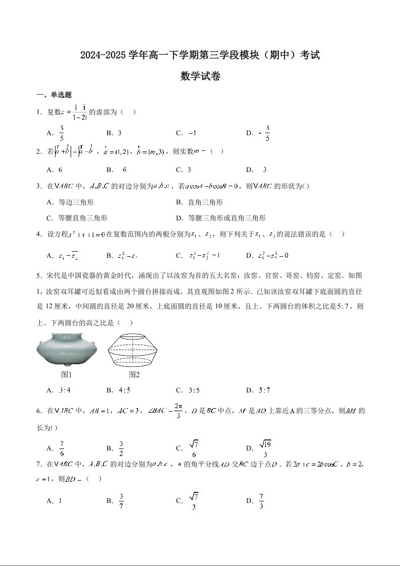 福建省福州第一中学2024-2025学年下学期高一期中考试数学+答案