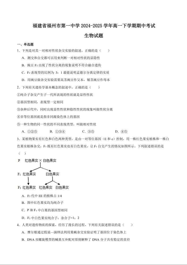 福建省福州第一中学2024-2025学年下学期高一期中考试生物+答案