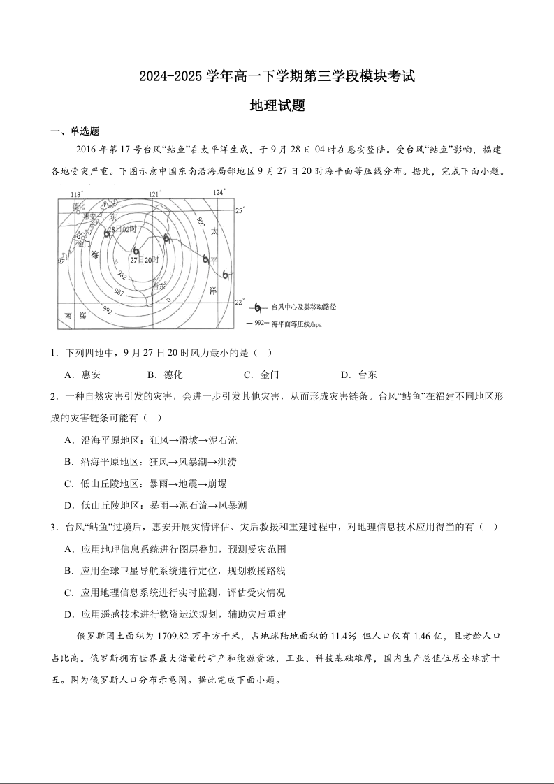 福建省福州第一中学2024-2025学年下学期高一期中考试地理+答案