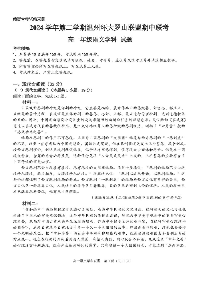 浙江省温州市环大罗山联盟2024-2025学年下学期高一期中考试语文+答案