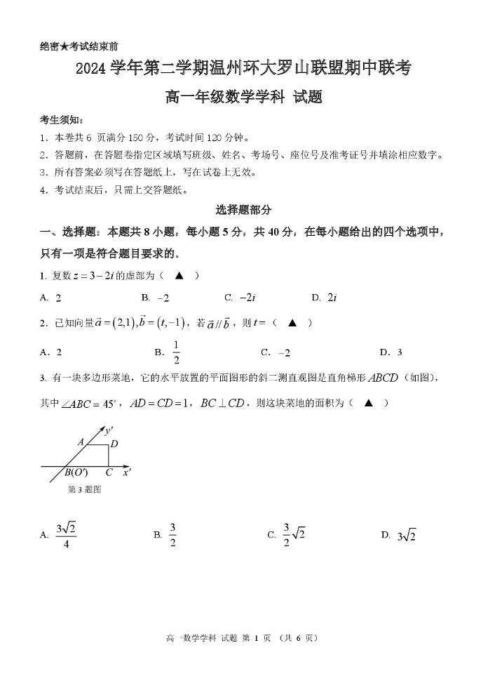 浙江省温州市环大罗山联盟2024-2025学年下学期高一期中考试数学+答案