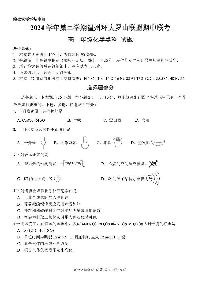浙江省温州市环大罗山联盟2024-2025学年下学期高一期中考试化学+答案