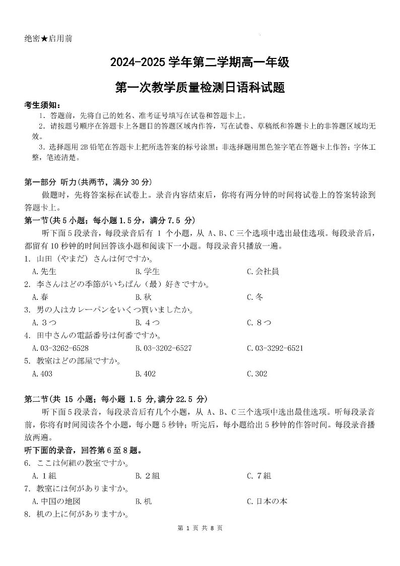 广东省区域高中2024-2025学年下学期高一第一次教学质量联考日语