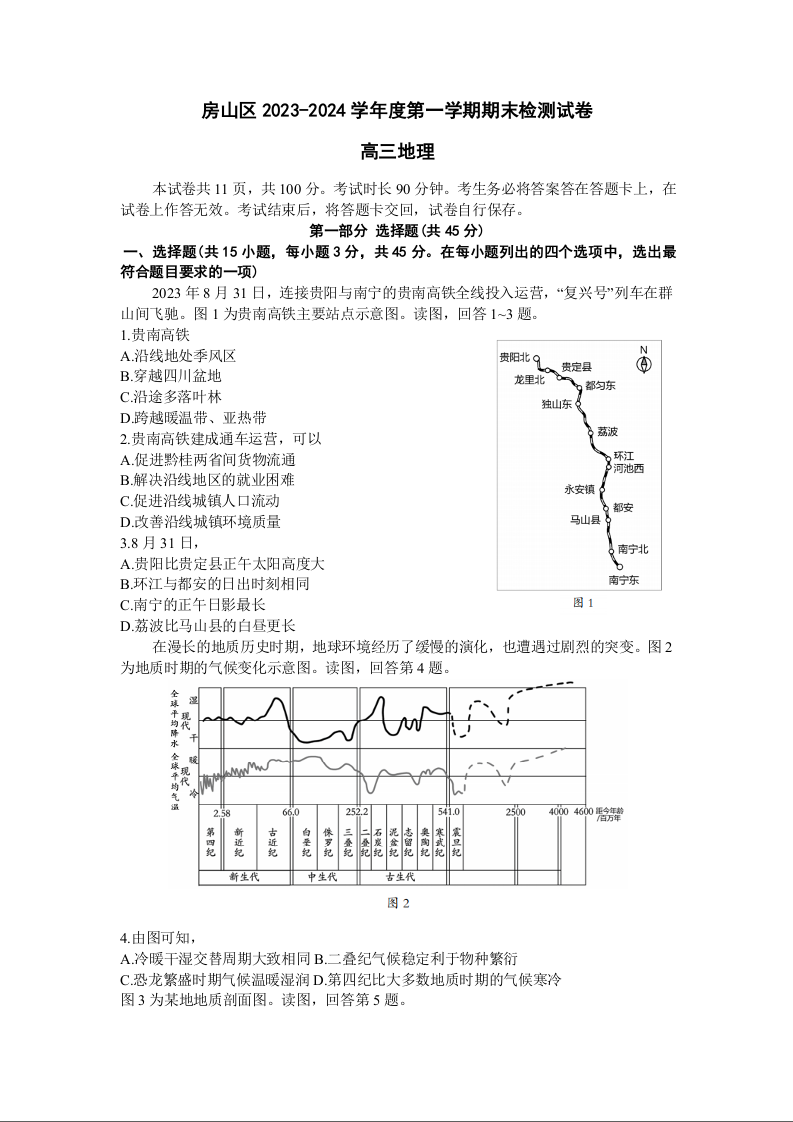 北京市房山区2024届高三上学期期末考试地理+答案