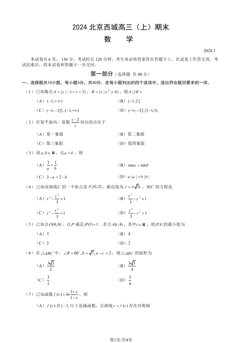 北京市西城区2024届高三期末数学+答案