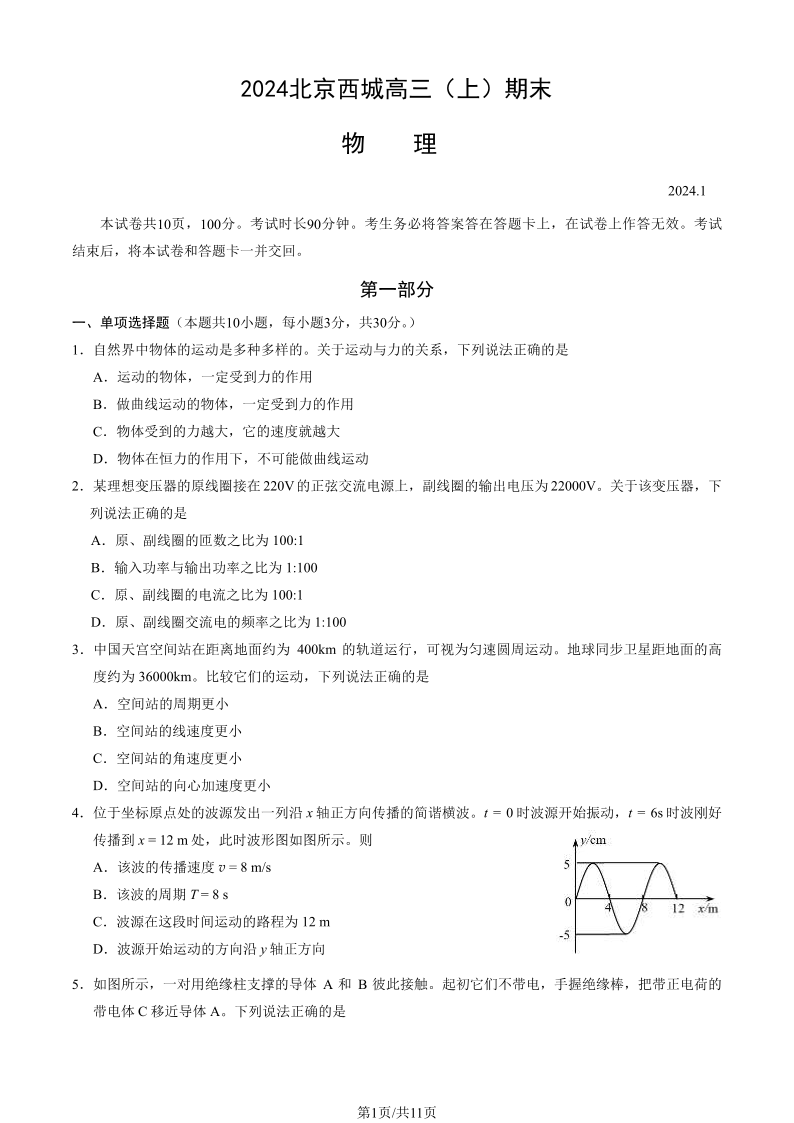 北京市西城区2024届高三期末物理+答案