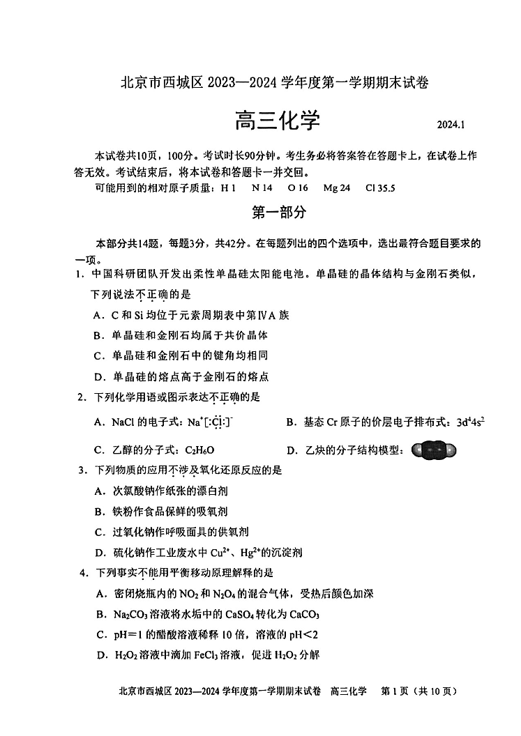 北京市西城区2024届高三期末化学+答案