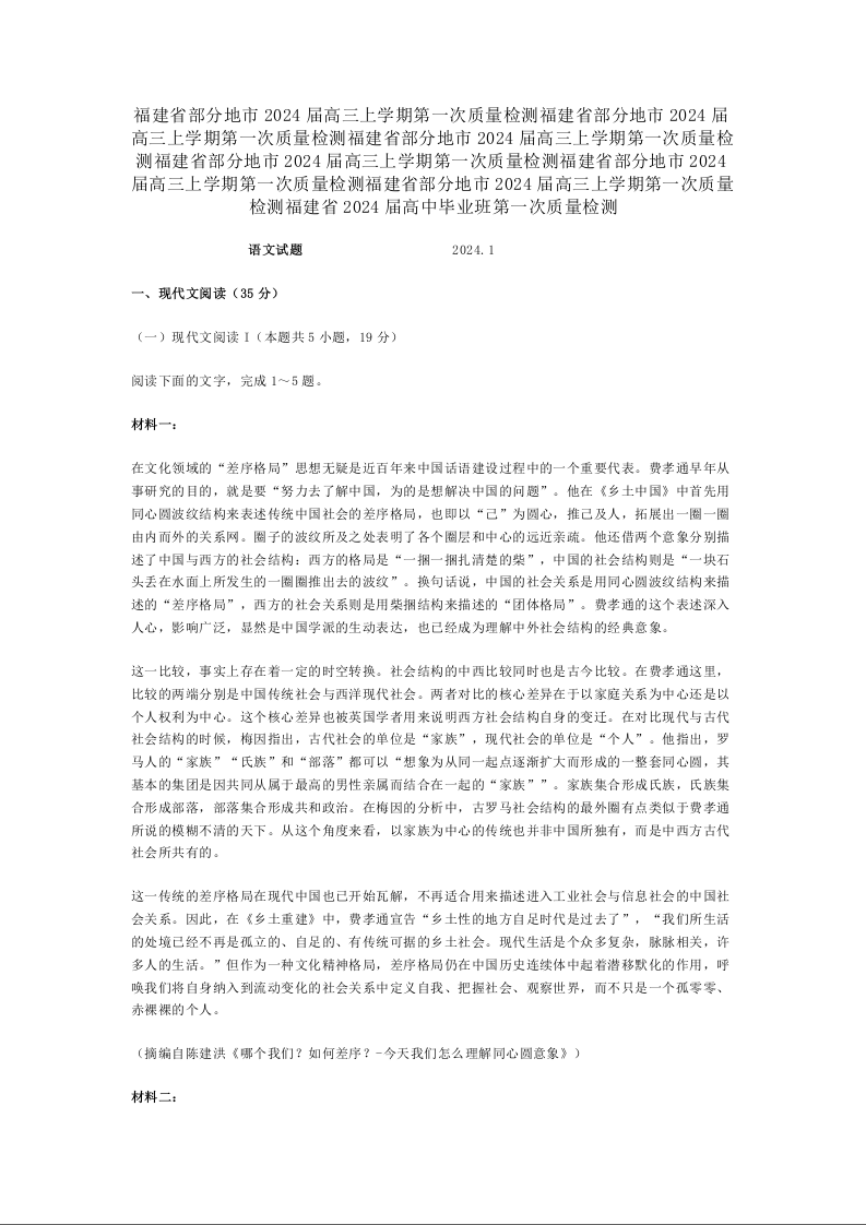 福建省部分地市2024届高三上学期第一次质量检测语文+答案