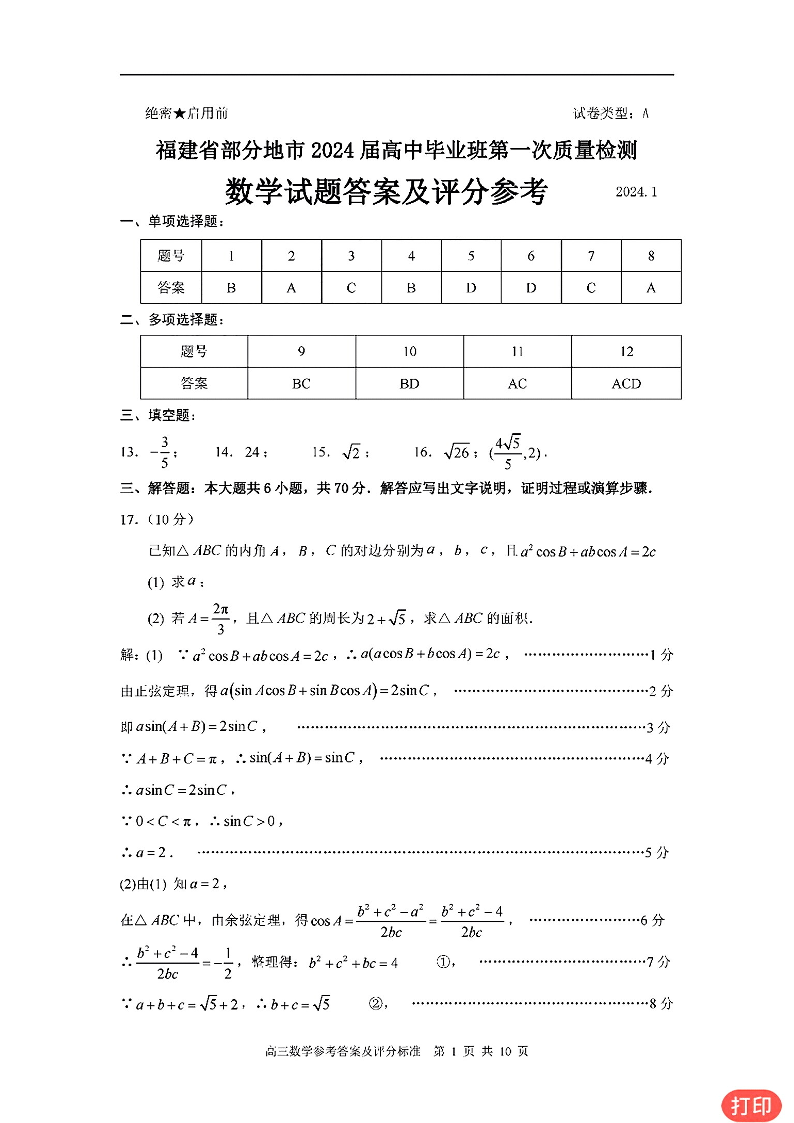 福建省部分地市2024届高三上学期第一次质量检测数学答案