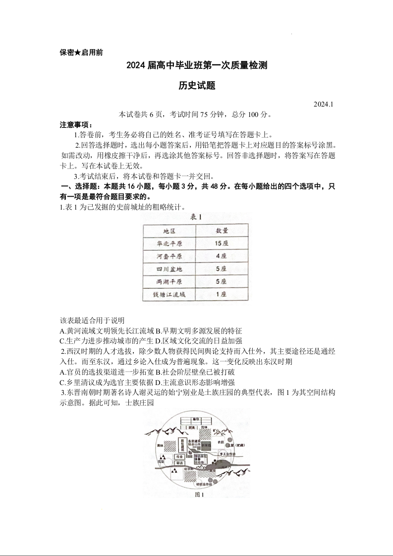 福建省部分地市2024届高三上学期第一次质量检测历史+答案