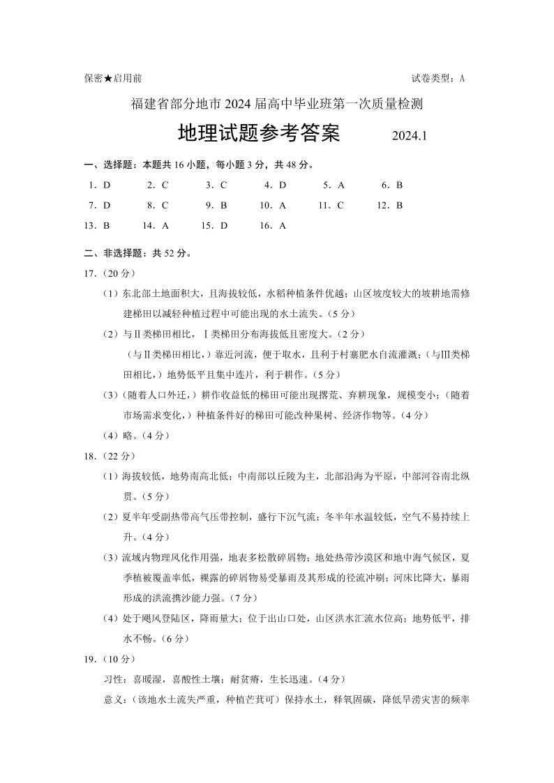 福建省部分地市2024届高三上学期第一次质量检测地理答案