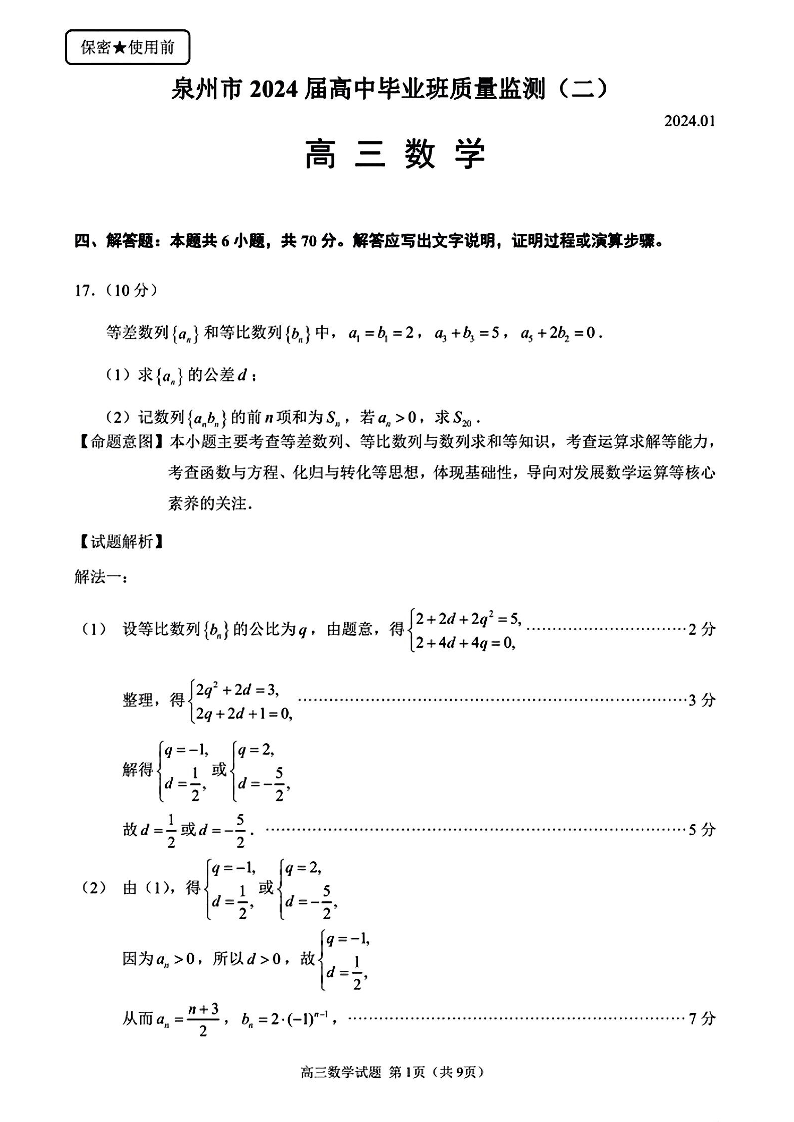 福建省泉州市2024届高中高三上学期毕业班质量监测(二)数学答案
