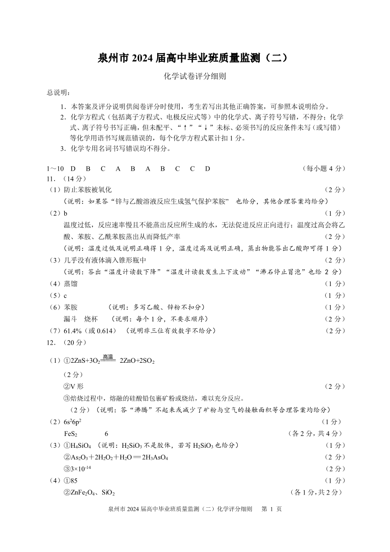 福建省泉州市2024届高中高三上学期毕业班质量监测(二)化学答案