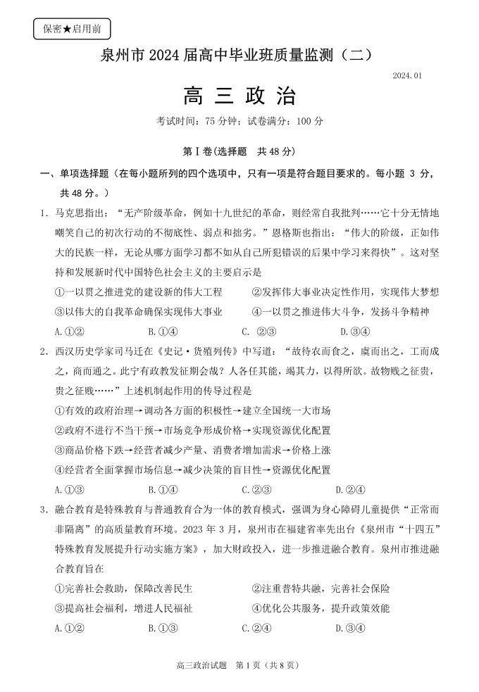 福建省泉州市2024届高中高三上学期毕业班质量监测(二)政治